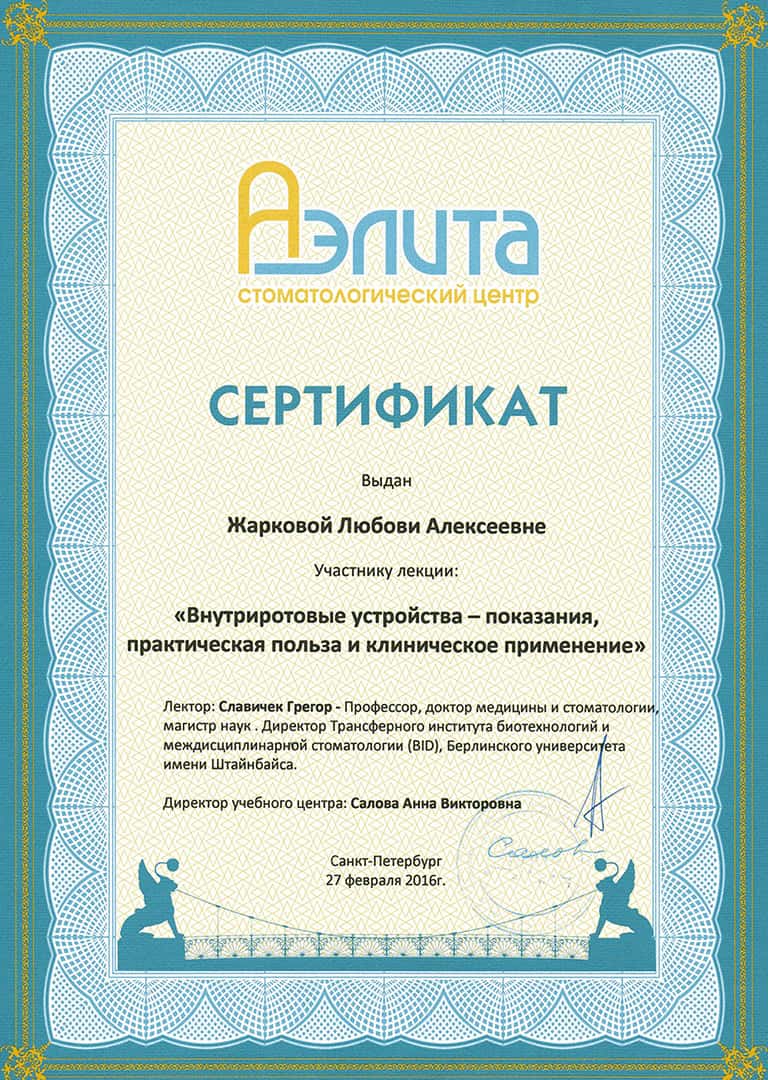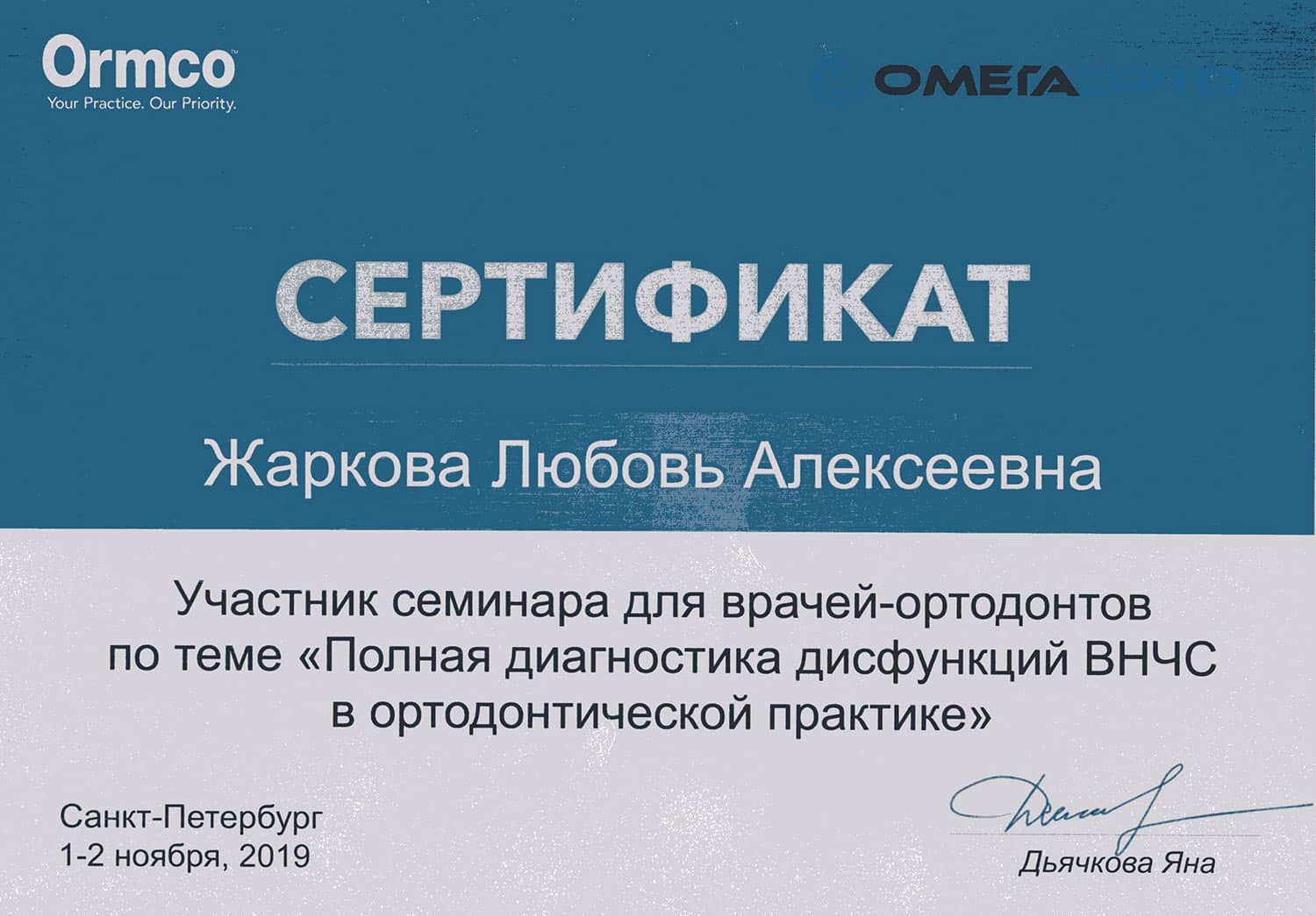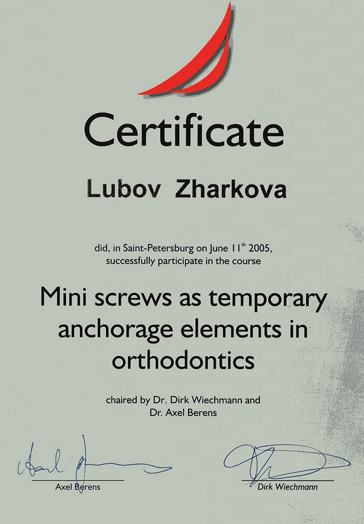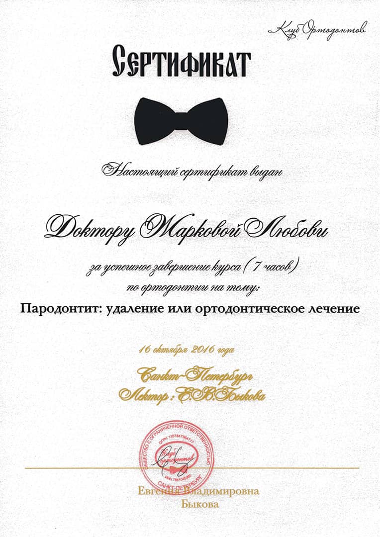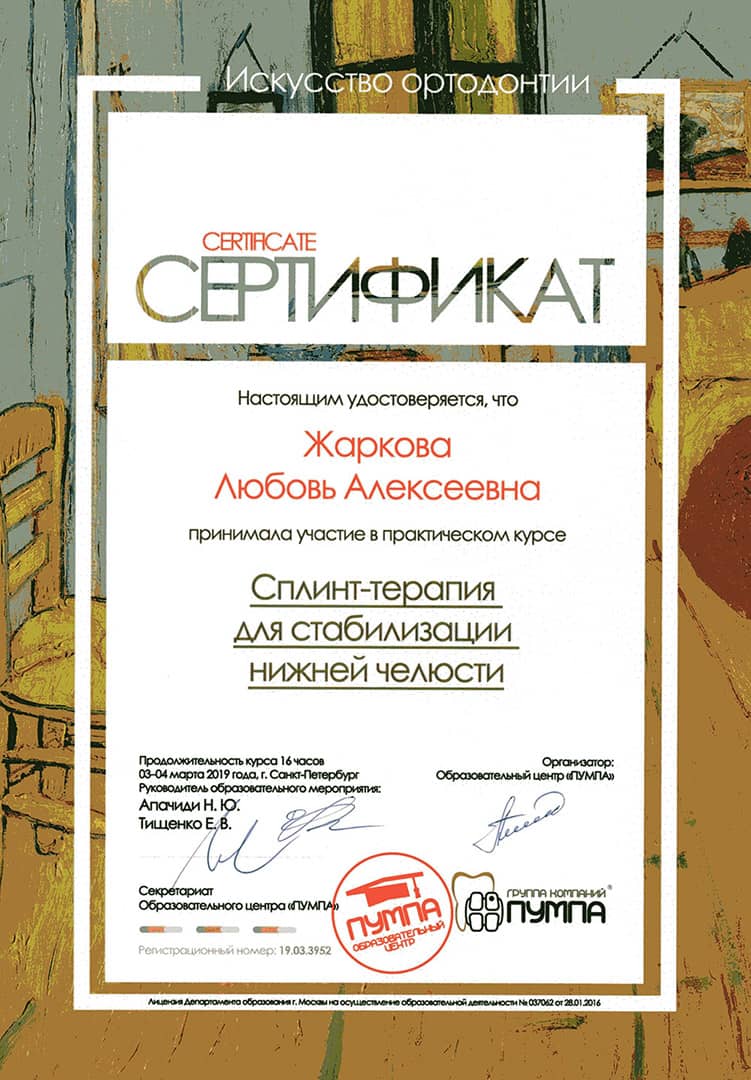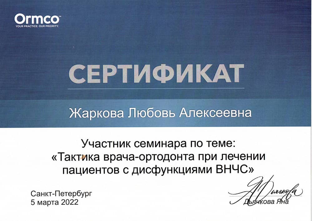 В 1990 году окончила клиническую ординатуру по специальности «Ортодонтия» в Первом Ленинградском медицинском университете им. академика И.П.Павлова.